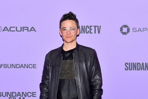 Sam Feder photographed on the Sundance red carpet against a press background with