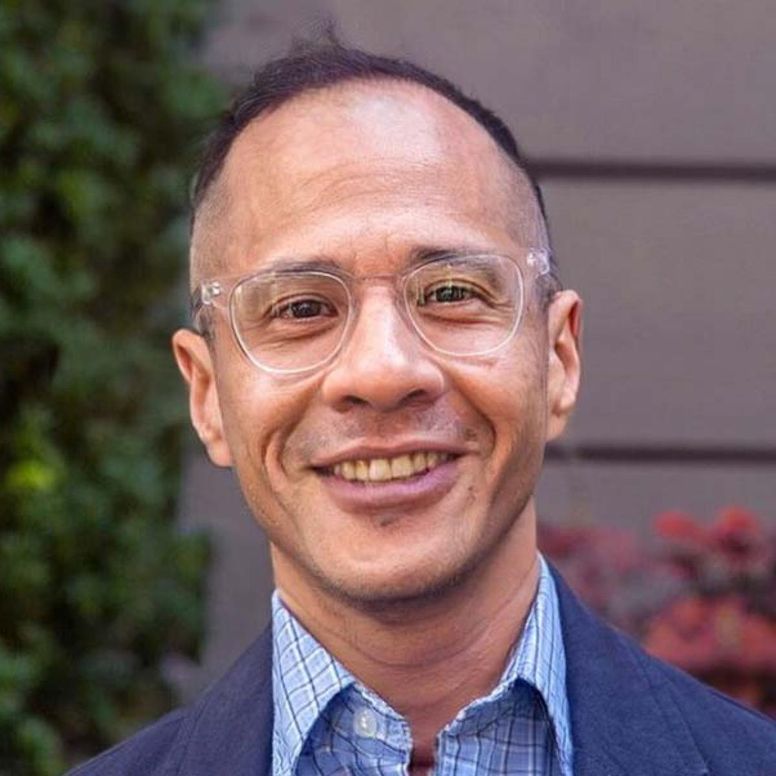 Félix Endara is an Ecuadorian transgender man with light brown skin. He is wearing a navy blue suit with a light blue checkered button up. He has short hair and is wearing clear framed glasses. Félix is in front of a blurred grey wall with a green bush on the left and redish flowers on the right.