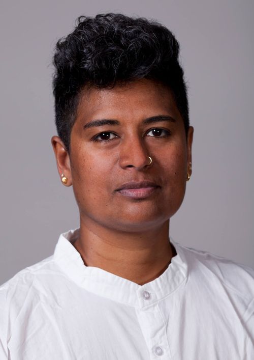 Neelu Bhuman is a nonbinary trans masc South Indian person with dark brown skin wearing
