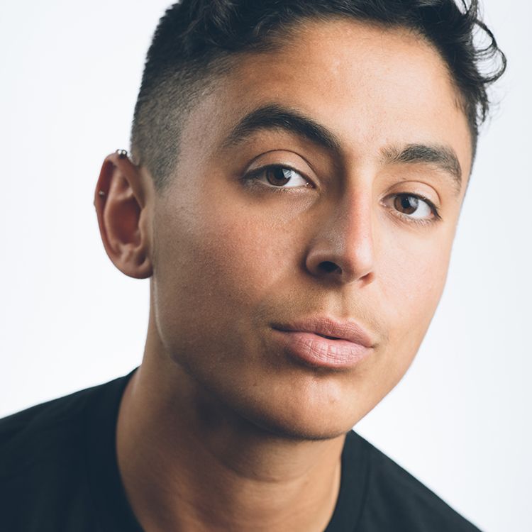 Pidgeon Pagonis is Mexican and intersex with light brown skin in front of a white
