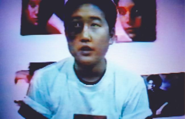 t-shirt underneath. They have short black hair and a big dark spot on their left eye