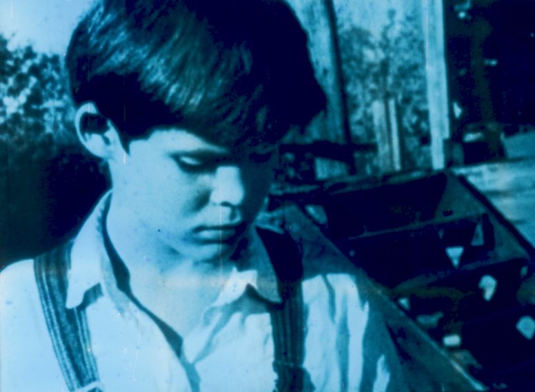 A close up of a light-skinned child gazing toward the ground. They appear from the