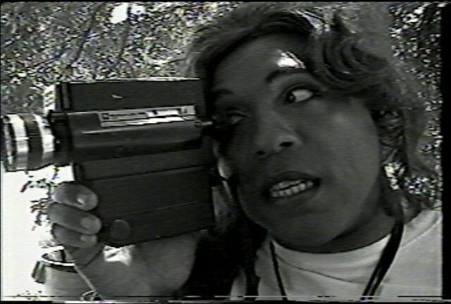 Black-and-white film still of Vaginal Davis peering through a video camera. Vaginal