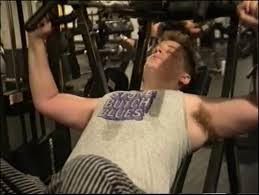 Still of a person weightlighting, likely Leslie Feinberg. Ze has an expression of concentraion, light skin, short blond hair, and wears a grey shirt that says "Stone Butch Blues".